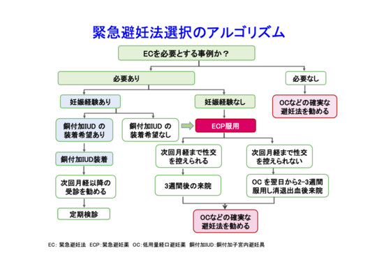 緊急避妊薬内服後に銅付加子宮内避妊具装着か、3週後婦人科か、低用量ピル内服かの選択肢有り